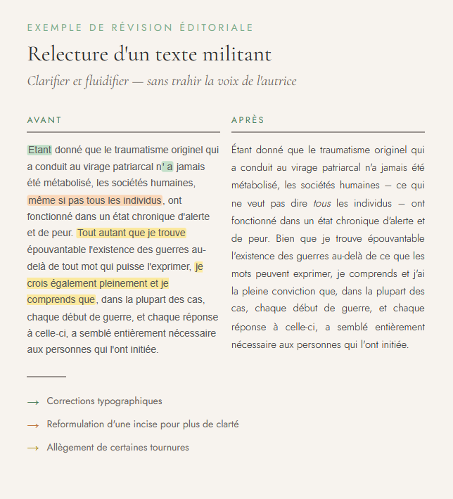 Je corrige les éventuelles erreurs, je clarifie les formulations maladroites, j’harmonise le ton et j’ajuste légèrement la structure lorsque cela permet de rendre le message plus clair et plus fluide.